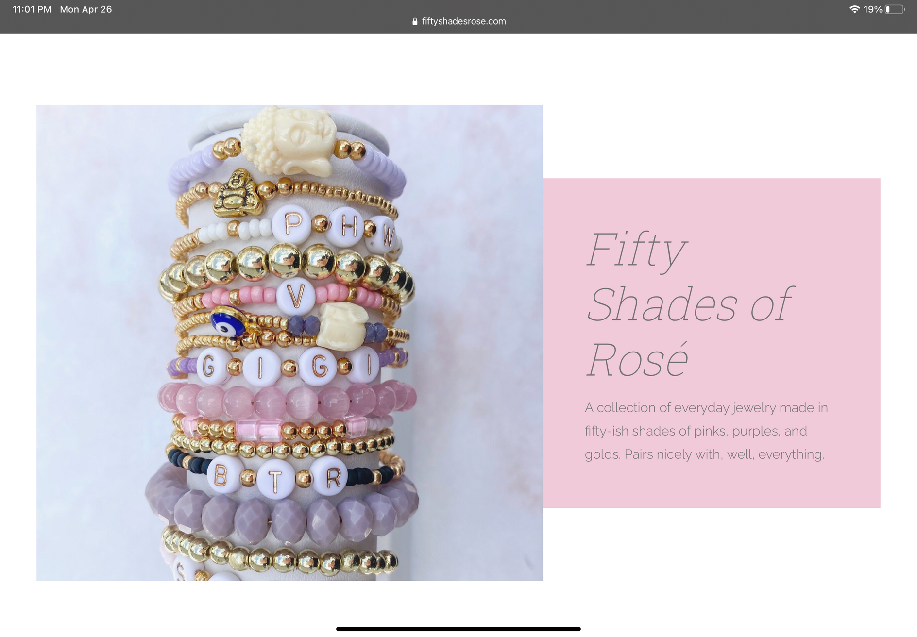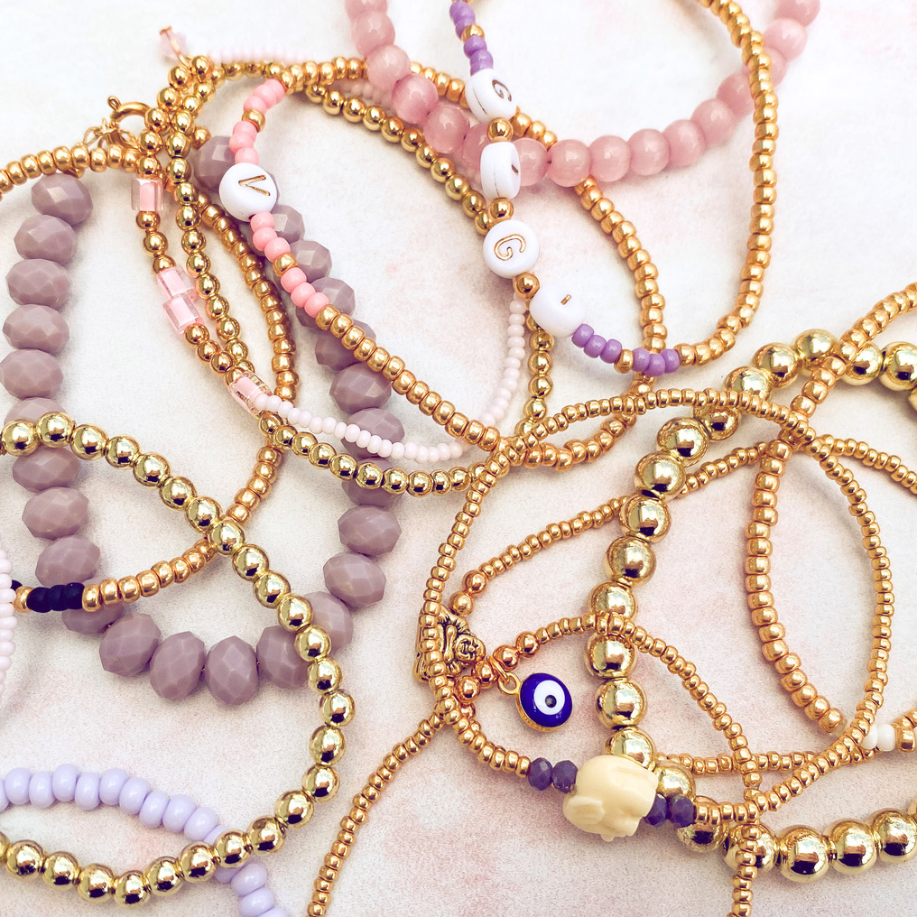 A collection of everyday jewelry made in fifty-ish shades of pinks, purples, and golds. Pairs well with, or without, a glass of rosé.